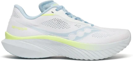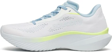 The Saucony Kinvara 15 Women’s in White/Icemelt (Size 7.5) is a sleek, lightweight running shoe designed for everyday training and speed work. Featuring