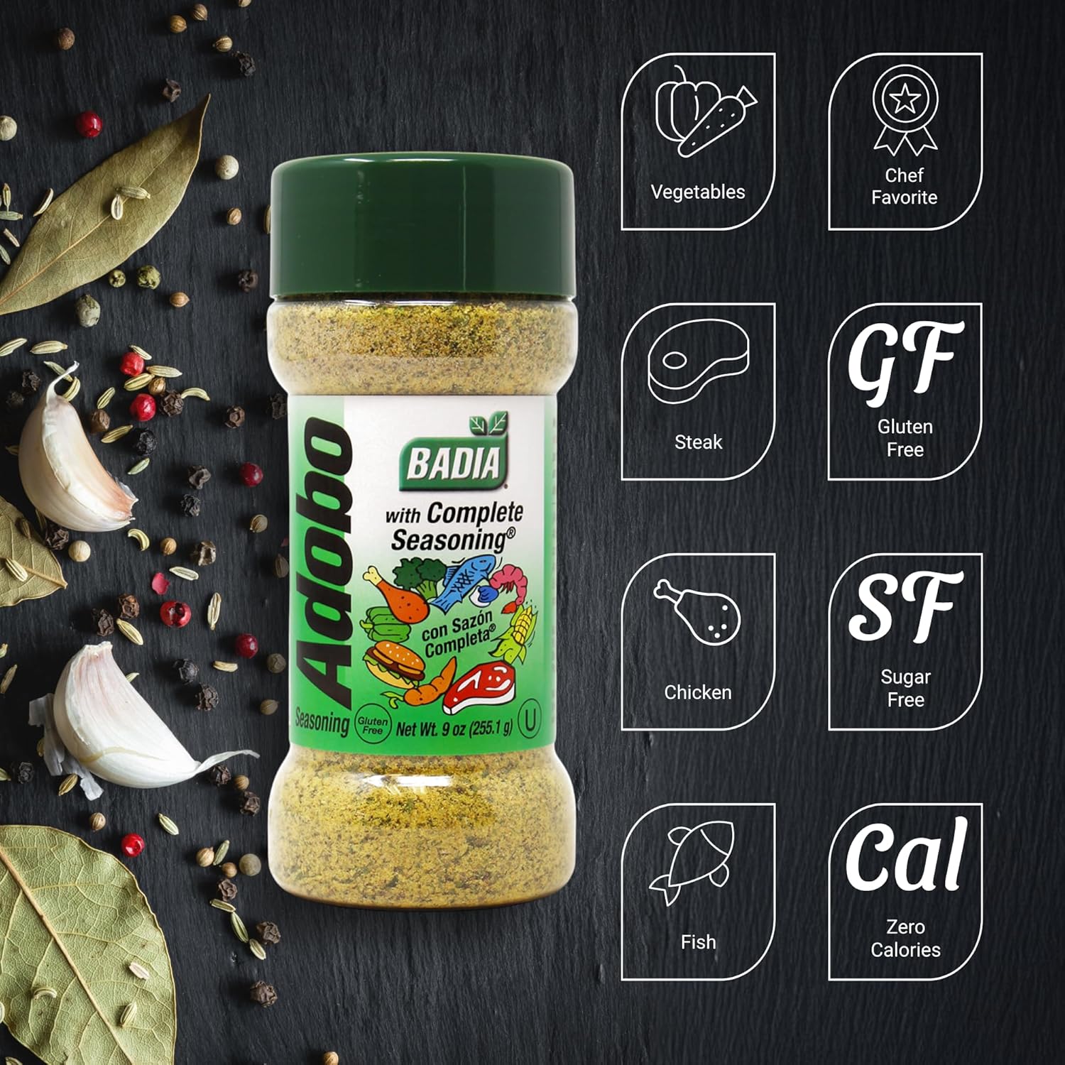 Enhance your everyday cooking with Badia Adobo with Complete Seasoning. This all-purpose blend combines garlic, onion, pepper, and traditional Latin spices to deliver bold, savory flavor to meats, vegetables, rice, and more. The 9 oz shaker makes seasoning quick and convenient, giving every dish an instant flavor boost.