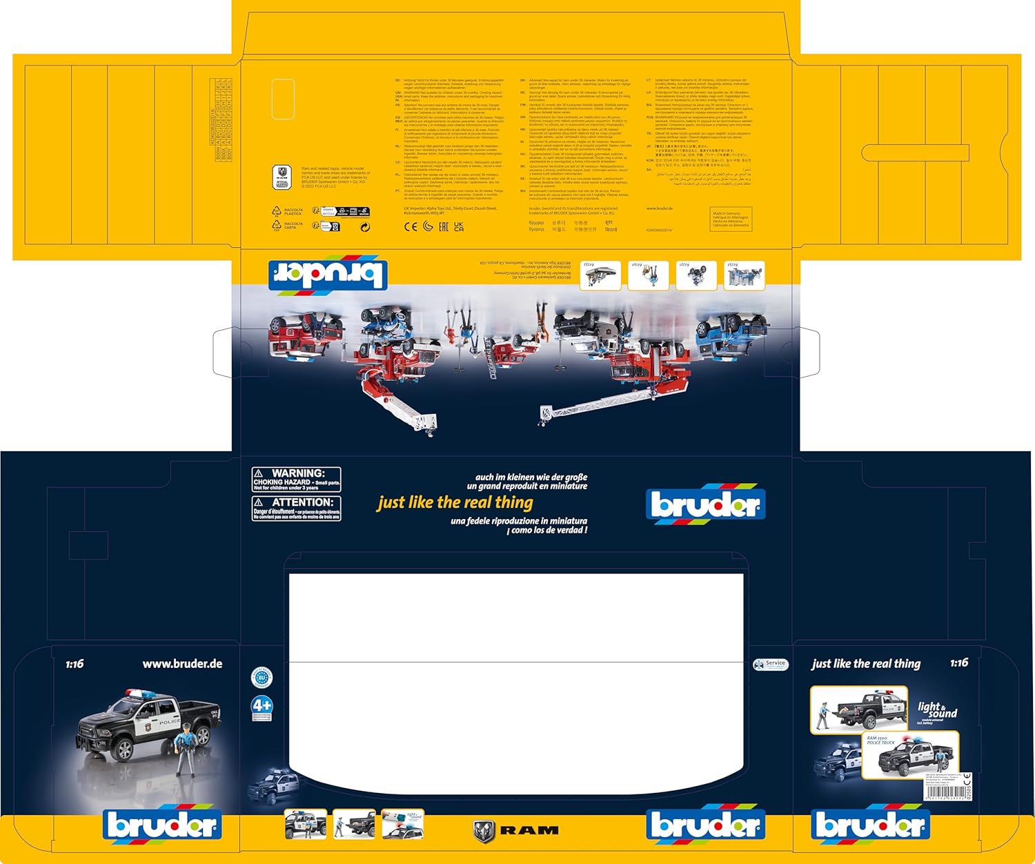 Bruder Police Pick-Up Truck with Police Officer brings exciting rescue and law enforcement adventures to life. Featuring realistic details, opening doors, suspension, and light-and-sound effects, this durable truck is ready for action-packed patrol missions.