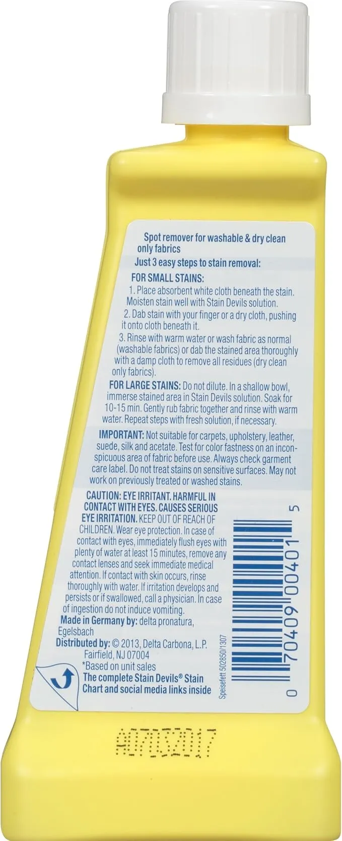 Carbona Stain Devils Remover, 1.70 oz is a powerful, targeted stain remover designed to treat tough, specific stains with ease. Formulated to break down stains at the molecular level, it works quickly on fabrics, upholstery, and washable materials—restoring items to their original look without damaging the fibers. Perfect for everyday mishaps and stubborn spots that regular detergents can’t handle.