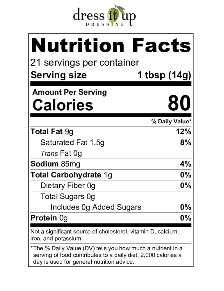 Dress it Up Champagne Vinaigrette combines champagne vinegar, zesty herbs, and extra virgin olive oil for a sparkling, flavorful blend. Perfect for fruit-based salads or as a marinade, this dressing is packed with heart-healthy fats and wholesome ingredients. With awards for quality and sustainability, it’s a delicious, healthy choice you can trust!