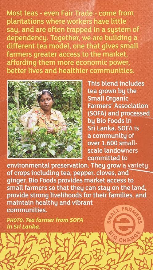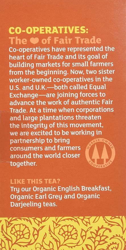 Equal Exchange Organic Chai Black Tea, 20 Ct (1.41 Oz), blends bold, full-bodied black tea with organic spices like cinnamon, cardamom, and cloves for a rich and aromatic experience. This fair trade, organic chai offers a perfectly balanced warmth and spice—ideal for cozy mornings or relaxing afternoons.