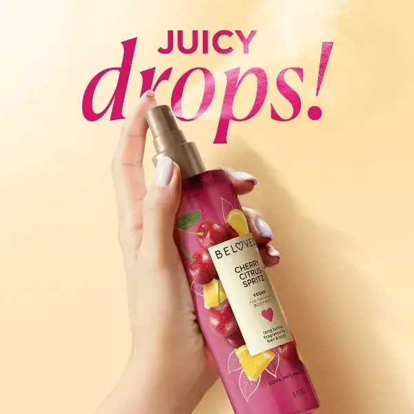 Love Beauty and Planet Beloved Body Mist in Cherry Citrus Spritz (8 oz) energizes your senses with a vibrant blend of juicy cherries and zesty citrus—perfect for a fresh, fruity pick-me-up.