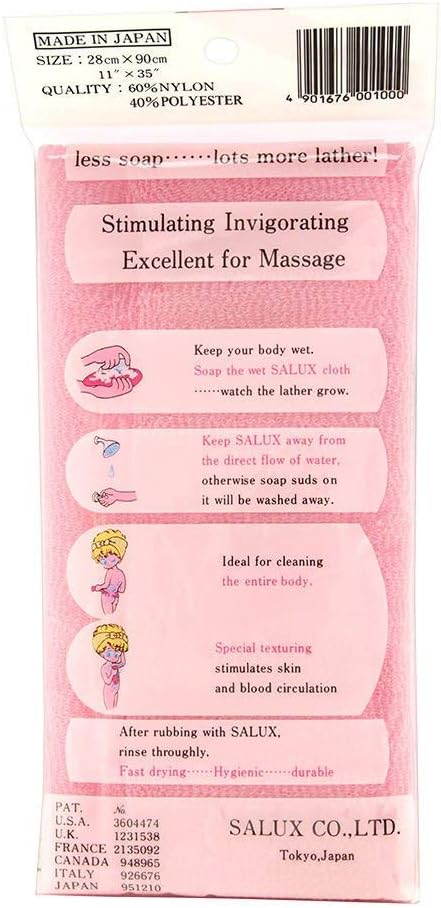 The SALUX Nylon Japanese Beauty Skin Bath Wash Cloth is a long, lightweight bath towel made of nylon (and typically some polyester blend) designed for gentle yet effective body cleansing and exfoliation. Its fine, textured weave produces rich lather and helps cleanse and refresh skin, leaving it smooth and clean — ideal for daily bathing or spa-like shower routines.