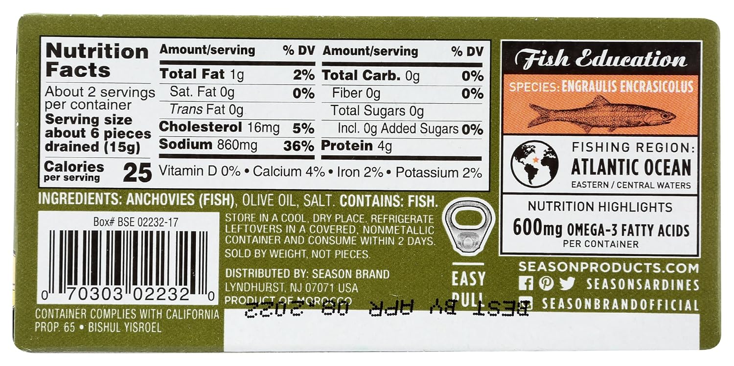 Enjoy bold, savory seafood flavor with Season Anchovies Flat Fillets in Olive Oil, 2 oz. Hand-packed and preserved in premium olive oil, these tender anchovy fillets deliver rich umami taste perfect for topping pizzas, adding depth to sauces, or enhancing salads and Mediterranean dishes. Sustainably sourced and responsibly processed for quality you can trust.