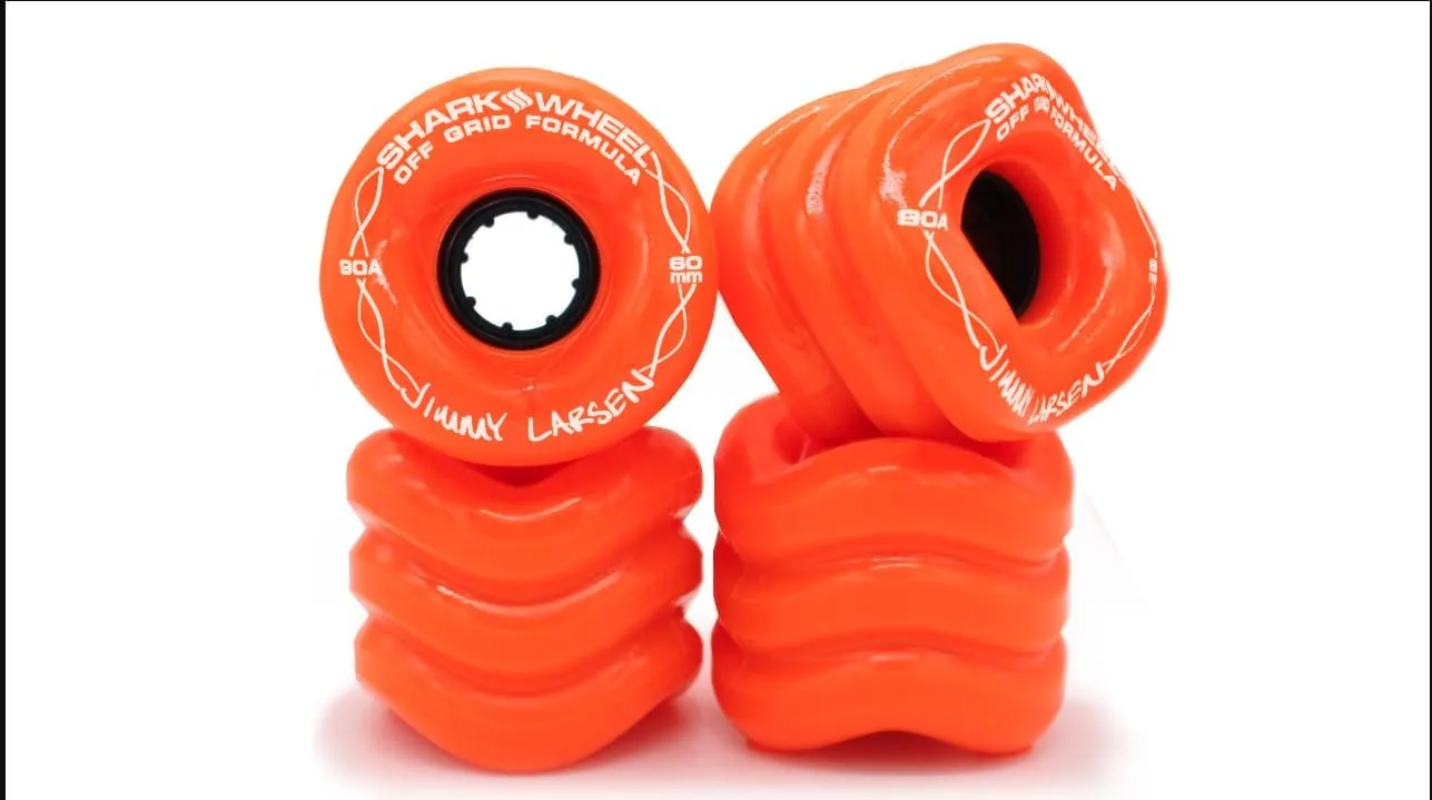 Signature sine-wave / wave-pattern shape (“three lips”) — Unlike standard round wheels, Shark Wheel’s design is claimed to reduce rolling resistance, channel out debris, sand or water, and provide smoother roll over less-perfect surfaces.