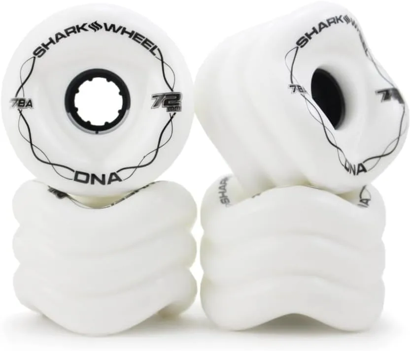Cruise in style with the Shark Wheel DNA 72 mm wheels. These solid white (with black accents) wheels feature the brand’s signature sine-wave shape for smoother rides, more grip, and a distinctive look. At 72 mm diameter and 78a durometer, they’re ideal for relaxed cruising, carving, and everyday board use.