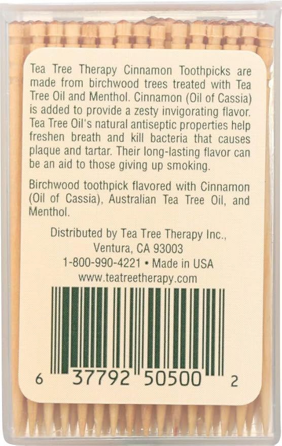 • Natural Ingredients: Made with high-quality, natural ingredients for effective oral hygiene.Tea Tree Therapy Cinnamon Toothpicks combine the fresh flavor of cinnamon with the natural benefits of tea tree oil. These toothpicks are perfect for maintaining oral hygiene while enjoying a refreshing taste. With 100 toothpicks in each pack, they’re an easy and natural way to keep your teeth clean and your breath fresh.