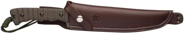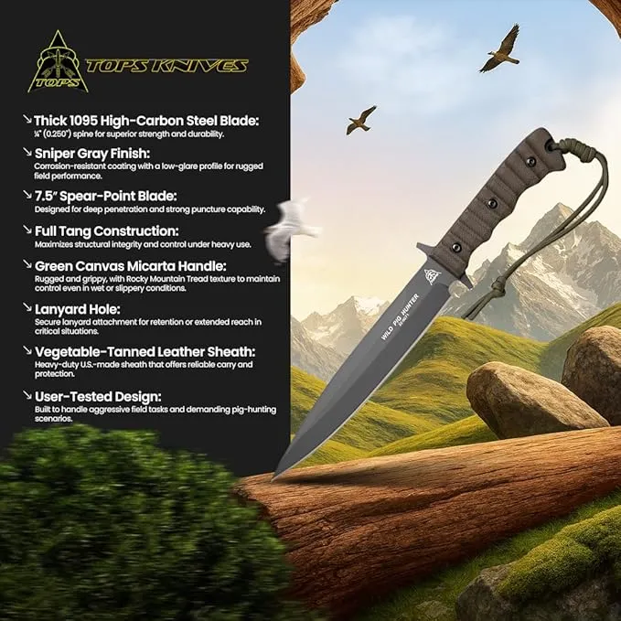 The TOPS Knives Wild Pig Hunter is a rugged, high-performance fixed blade designed for hunters, outdoorsmen, and survivalists who need maximum penetration, strength, and reliability. Built with a thick, full-tang blade and crafted from premium high-carbon steel, this knife delivers exceptional durability and cutting performance. Its long, tapered point is engineered for deep penetration, making it ideal for hog hunting and other demanding field tasks. With a comfortable, slip-resistant handle and robust construction, the Wild Pig Hunter is ready for the toughest backcountry environments.
