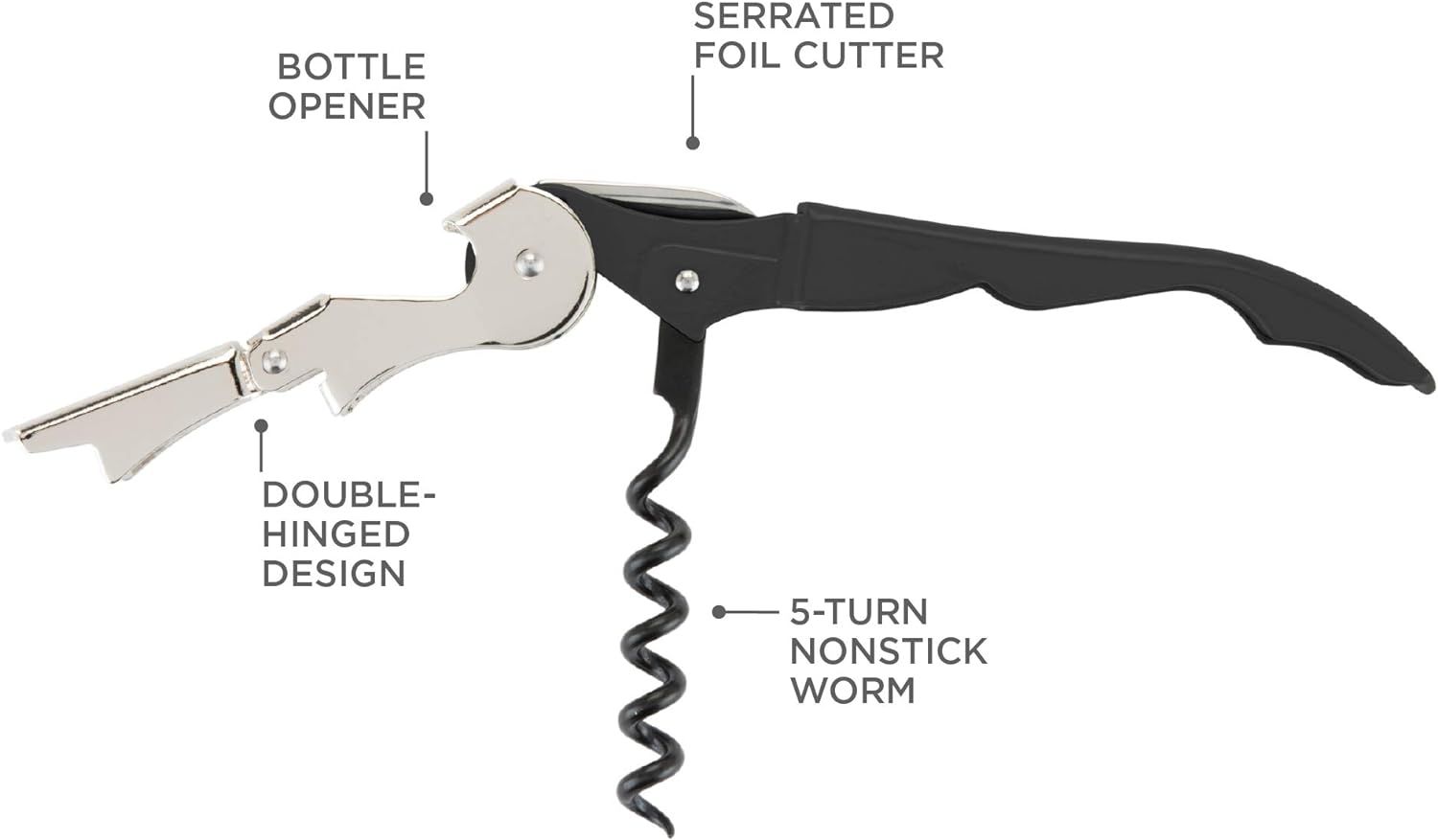 - Multi-Function Tool – Includes a bottle opener, serrated foil cutter, and 5-turn non-stick worm