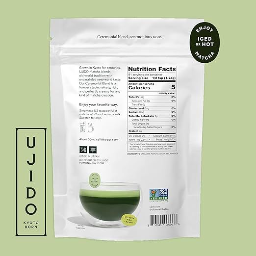 Ujido Ceremonial Blend Matcha Powder, 4 Oz, is a premium Japanese green tea finely stone-ground from shade-grown leaves. With its vibrant green color, smooth texture, and naturally sweet, umami-rich flavor, this ceremonial-grade matcha delivers sustained energy, focus, and antioxidants for a refreshing, mindful tea experience.