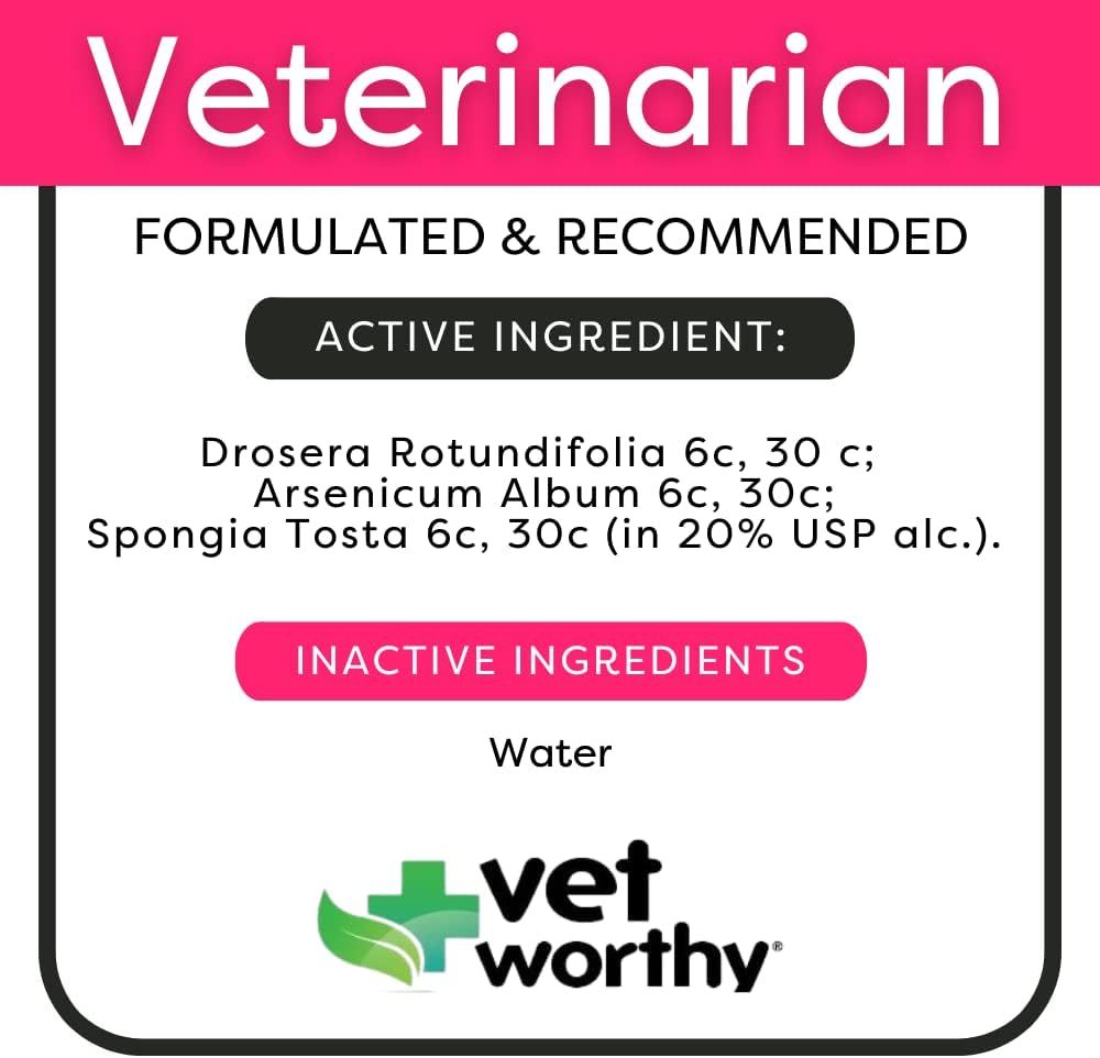 Vet Worthy Kennel Cough Drops, 0.5 oz, is a veterinarian-formulated homeopathic remedy designed to temporarily relieve dry, harsh coughing in dogs. Ideal for dogs over one year old, this liquid supplement is made with natural ingredients to help soothe throat irritation and support respiratory wellness.