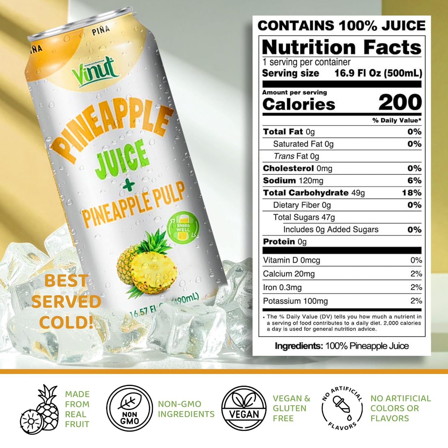Vinut 100% Fruit Juice with Pulp, Pineapple 16.57 Fl Oz 24 Pack