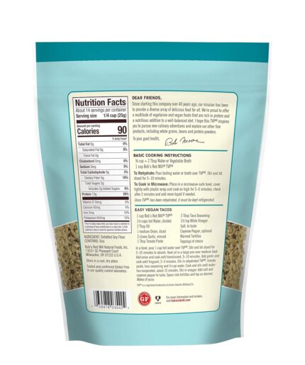 Bob’s Red Mill Textured Vegetable Protein (TVP) is a nutritious, plant-based meat alternative made from defatted soy flour. This 12