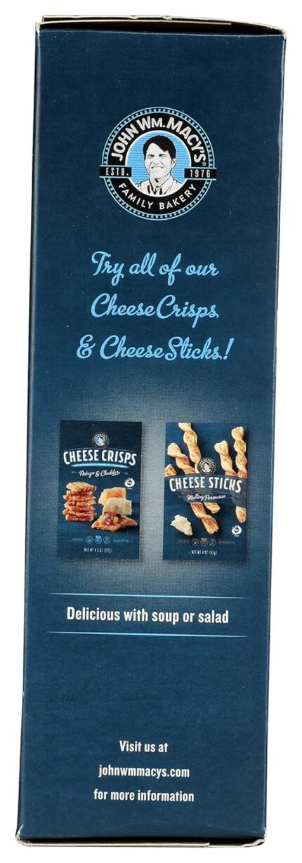 John Wm. Macy’s Original Cheddar CheeseSticks are handcrafted, twice-baked snacks made with real Vermont cheddar and Asiago cheeses layered into