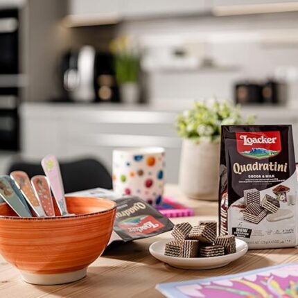 Loacker Quadratini Cappuccino Wafer Cookies are bite-sized Italian treats with crispy layers and smooth cappuccino cream. Made with premium, non-GMO