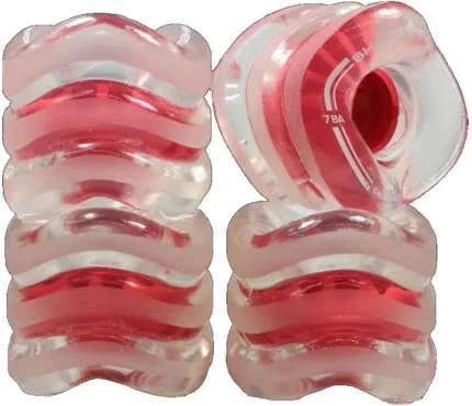 These 60 mm cruiser wheels from Shark Wheel in clear polyurethane with a red hub combine their signature wave-shape with